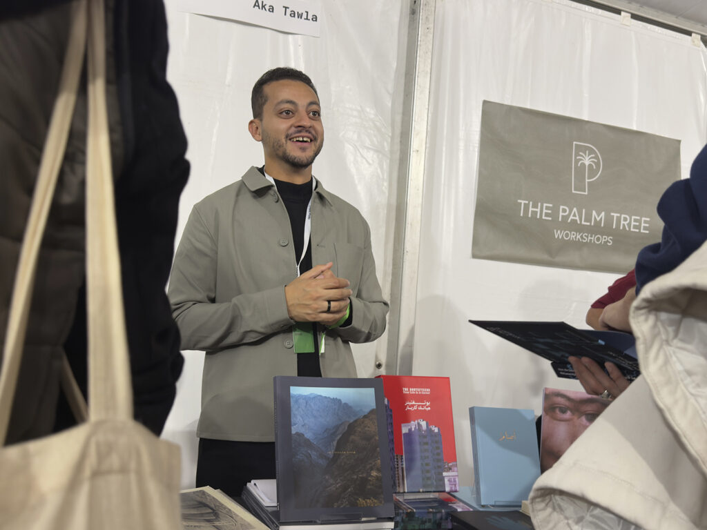 Mohamed Mahdy presenting his book Here the Doors Don’t Know Me at the stand of the collective Aka Tawla at Polycopies at the 2025 Paris Photo Fair.