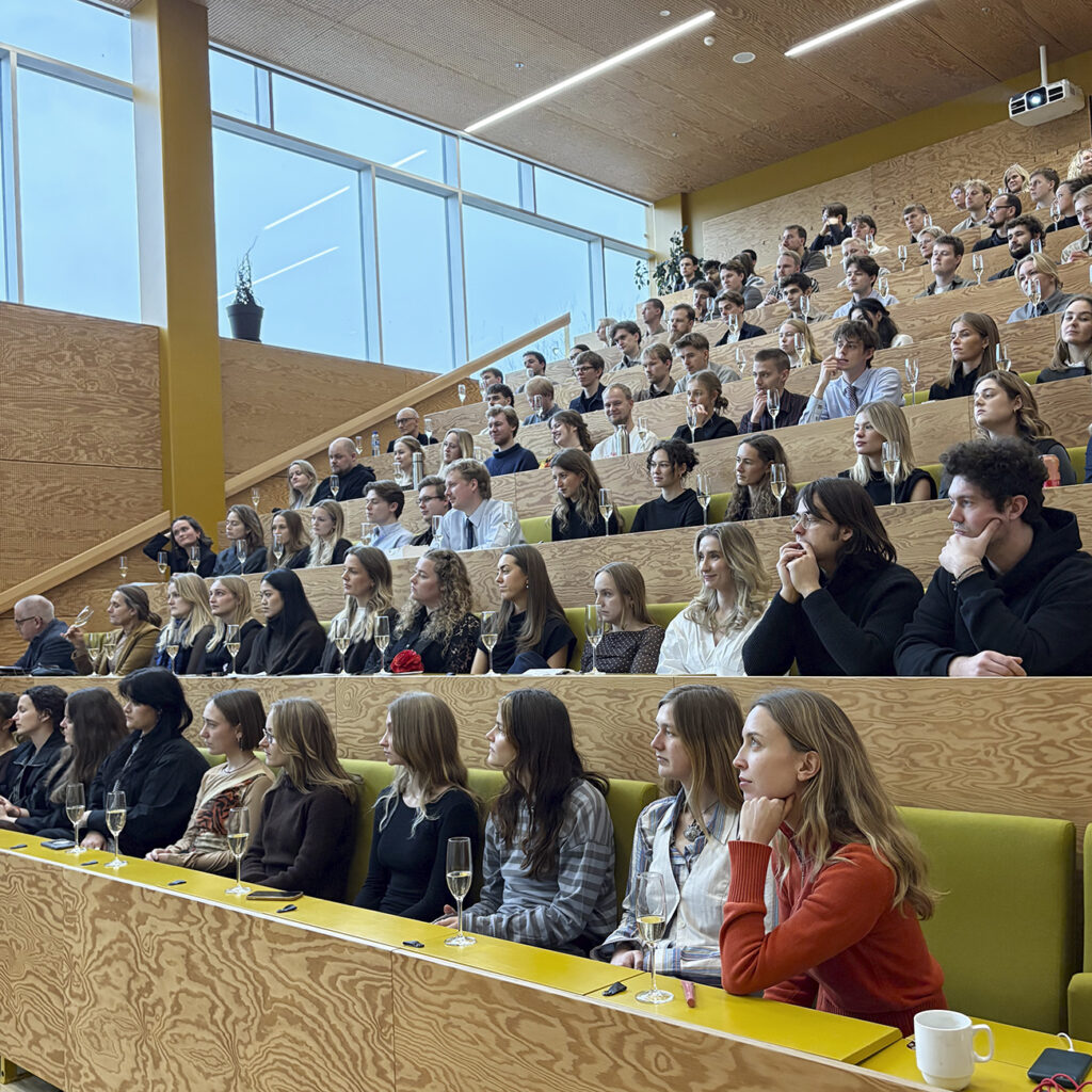 All graduating photojournalists and journalists listening to the speeches during the graduation ceremony in the Yellow Auditorium at DMJX, January 22, 2026. Photo: Søren Pagter/DMJX