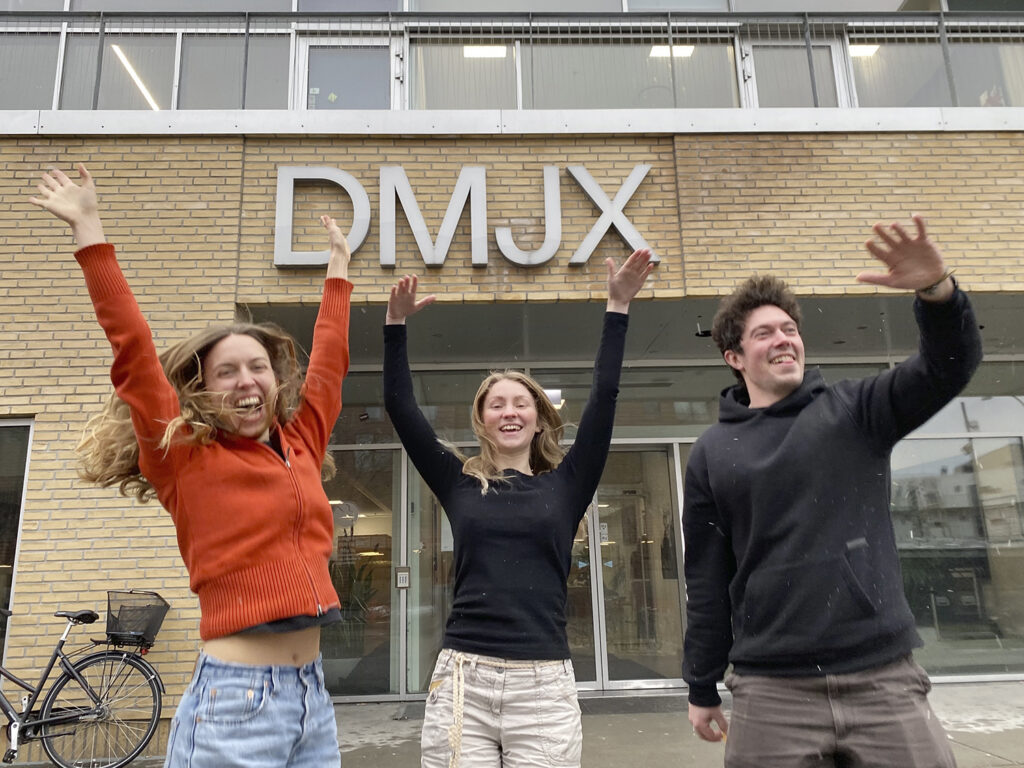 Søren Pagter and August Vinther celebrating after the graduation ceremony. Photo: Cecilie RolvungThe three graduating photojournalists, who have been interning together at Politiken. From left: Cecilie Rolvung, Signe Lægsgaard and Nicolai West. Photo: Miles Lilley.