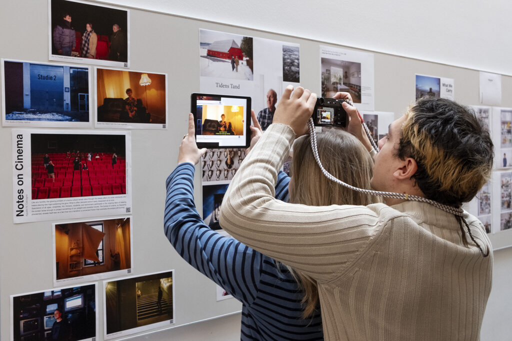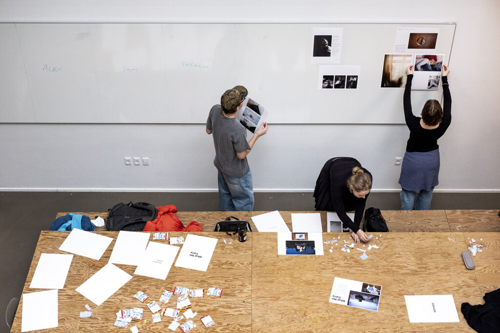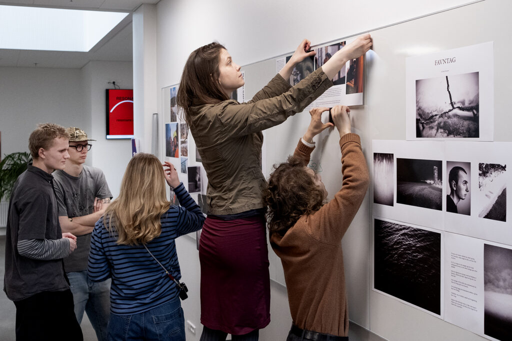 From leftMikkel Odd Højgaard, Lilly Vergnes and Ingrid Laub Ahlmann Olesen preparing and hanging their exhibition prints. Photo: Søren Pagter/DMJXFront from left: Camilla Matteoni, Louise Joenen and Claire Nguyen. Back from left: Agustin Nuñez Calcagno, Laura Juul Pallesen and Cora Trinkaus. Photo: Søren Pagter/DMJXLouise Joenen and Alexander Jæger Thorsager Nørbjerg waiting for the rest of the students to finish their displays. Photo: Søren Pagter/DMJXFrom left Alexander Jæger Thorsager Nørbjerg, Mikkel Odd Højgaard, Louise Joenen, Emma Brink Laursen and Carl Ravnbak. Photo: Søren Pagter/DMJXGuests visiting the exhibition just before the opening. Photo: Søren Pagter/DMJXLouise Joenen trying Agustin Nuñez Calcagno’s interactive exhibition, where you can watch short videos when holding a device in front of the image. Photo: Søren Pagter/DMJXThe students watching and reading each other’s stories. From left it is Carl Ravnbak, Agustin Nuñez Calcagno, Sadiq Al-Harasi, Bertil Georg Konow and Alexander Jæger Thorsager Nørbjerg. Photo: Søren Pagter/DMJXFrom left: Ingrid Laub Ahlmann Olesen, Matilda Feline Frank Rasmussen, Mathilde Wymer Poulsen, Lilly Vergnes, Cora Trinkaus, Bertil Georg Konow and Alexander Jæger Thorsager Nørbjerg. Photo: Søren Pagter/DMJX